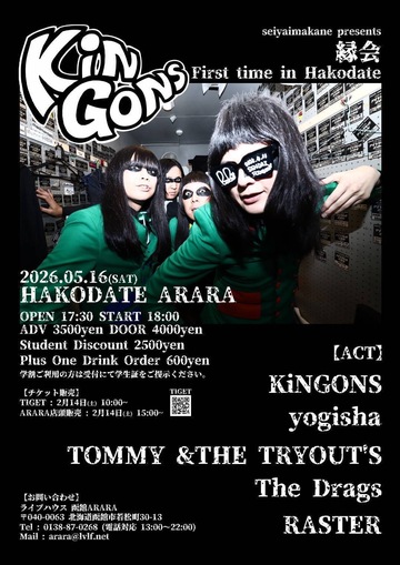 前売り3500円/当日4000円 +1D ¥600 学割¥2,500円(当日要証明証) 02/14(土)TIGET 10:00~ https://tiget.net/events/462763 ARARA店頭 15:00~ 入場順 ①TIGET →②ARARA店頭販売 →③地元手売りチケット→ ④KiNGONSホームページ予約→ ⑤地元バンド予約→⑥当日券 |