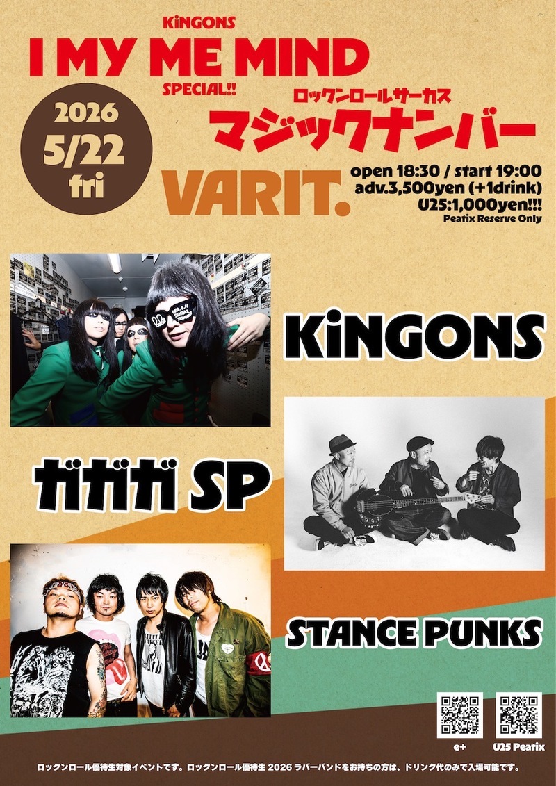 KiNGONS ガガガSP STANCE PUNKS OPEN18:30/START19:00 前売り¥3,500/当日¥4,000 U25 1,000円(+1drink 600円) ※Peatix予約必須 Peatix(U25予約のみ) varit-20260522.peatix.com ※ロックンロール優待生対象イベントです。ラバーバンド2026をお持ちの18歳以下の方はドリンク代のみで入場可能!! 3/24(火)10:00〜 https://eplus.jp/sf/detail/4480430001-P0030001 |