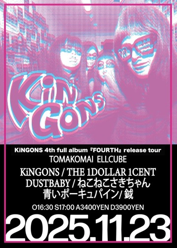 "KiNGONS 4th full album 『FOURTH』release tour" OPEN18:30/START19:00 前売り¥4,000/当日¥4,500/学割¥2,000(※バンドHP受付のみ可/当日証明出来るものを提示) 出演:KiNGONS ※ワンマンライブ!! ★KiNGONSレコ発は下北沢シェルターにてワンマンライブ!! -入場順- ①e+→②バンドHP予約→③当日 ▼e+(9/20 10:00〜) https://eplus.jp/sf/detail/4404910001-P0030001 |